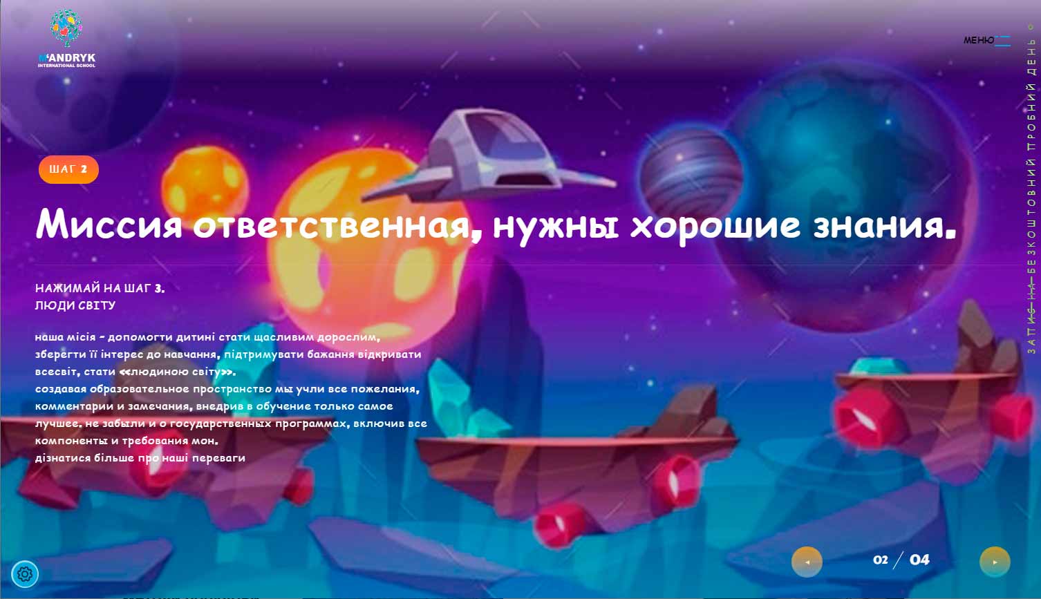 In ukraniane language the name of the school means adventurer / traveler. Chosen designtheme - Space.